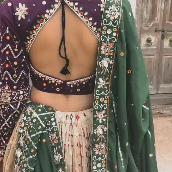 Cream Purple Lehenga Choli With Mirror Work And Attached Green Dupatta With..
