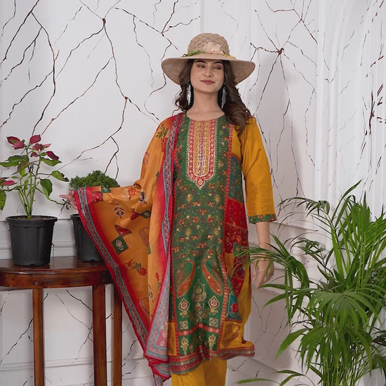 Ethnic Printed & Embroidered Straight Fit Kurta with Pant and Dupatta