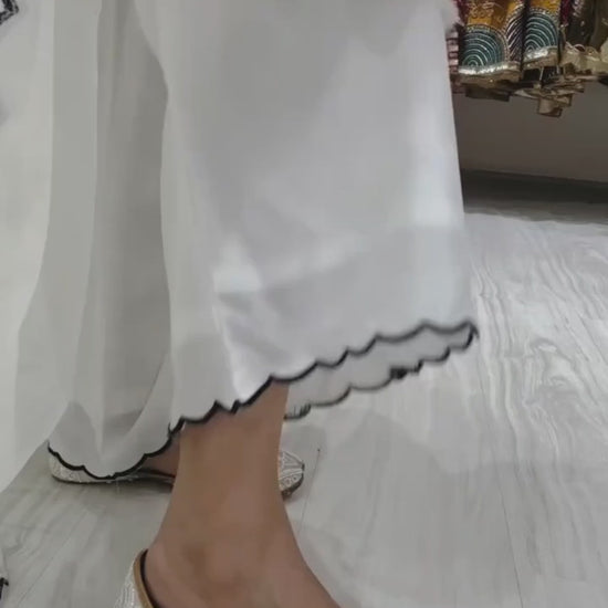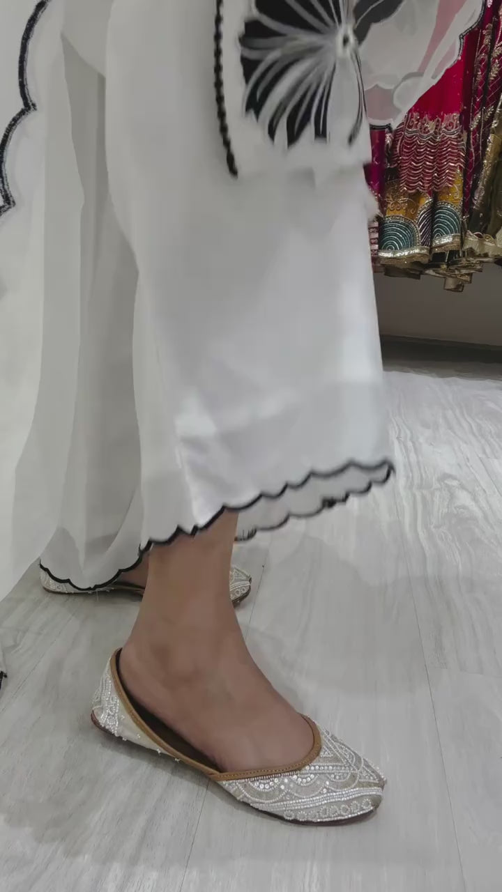- Work: Features intricate patch butta embroidery with bold floral motifs in black, along with delicate geometric threadwork. The scalloped edges and minimal detailing add a refined look.