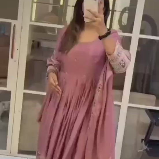 Step into the spotlight with our Royal Pure Chinon Silk Embroidered Gown Pant Dupatta Set — a masterpiece designed for festive charm and grand celebrations. Crafted from pure Chinon silk, this ready-to-wear ensemble features heavy embroidery with coding dori and 3–5mm sequin work, creating a dazzling effect. The full-sleeve gown adds an elegant flow, while the matching pant and dupatta complete the luxurious look.